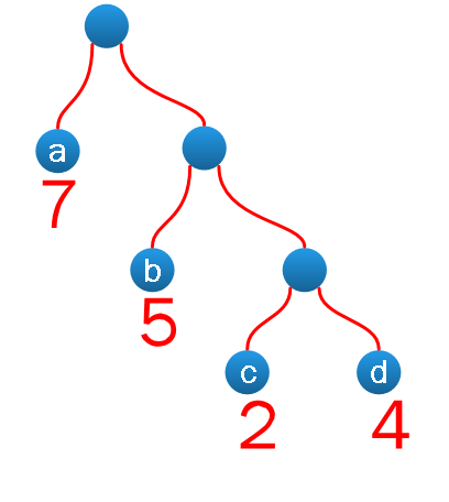 - 以 $d_1,d_2,\dots,d_n$作为叶结点,$w_1,w_2,\dots,w_n$ 作为叶结点的权值,构造一棵哈夫曼树。