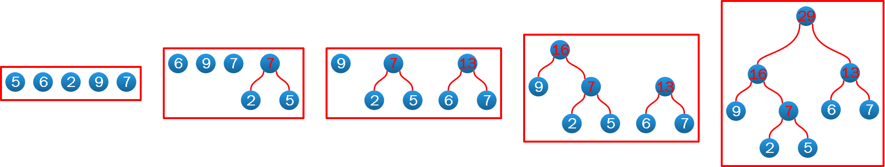 - 重复 2、3 步,当集合中只剩下一棵二叉树时,这棵二叉树就是哈夫曼树。
