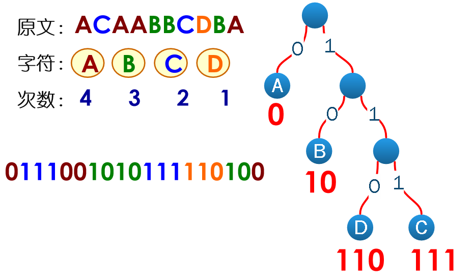 - 规定哈夫曼编码树的左分支代表 0 ,右分支代表 1 ,则从根结点到每个叶结点所经过的路径组成的 0 、1 序列即为该叶结点对应字符的编码。