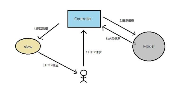 - Controller(控制器):服务员(接收顾客的点餐请求,告诉后厨做什么菜,做好后再告诉前台怎么端给顾客,自己不做菜也不展示菜单)。