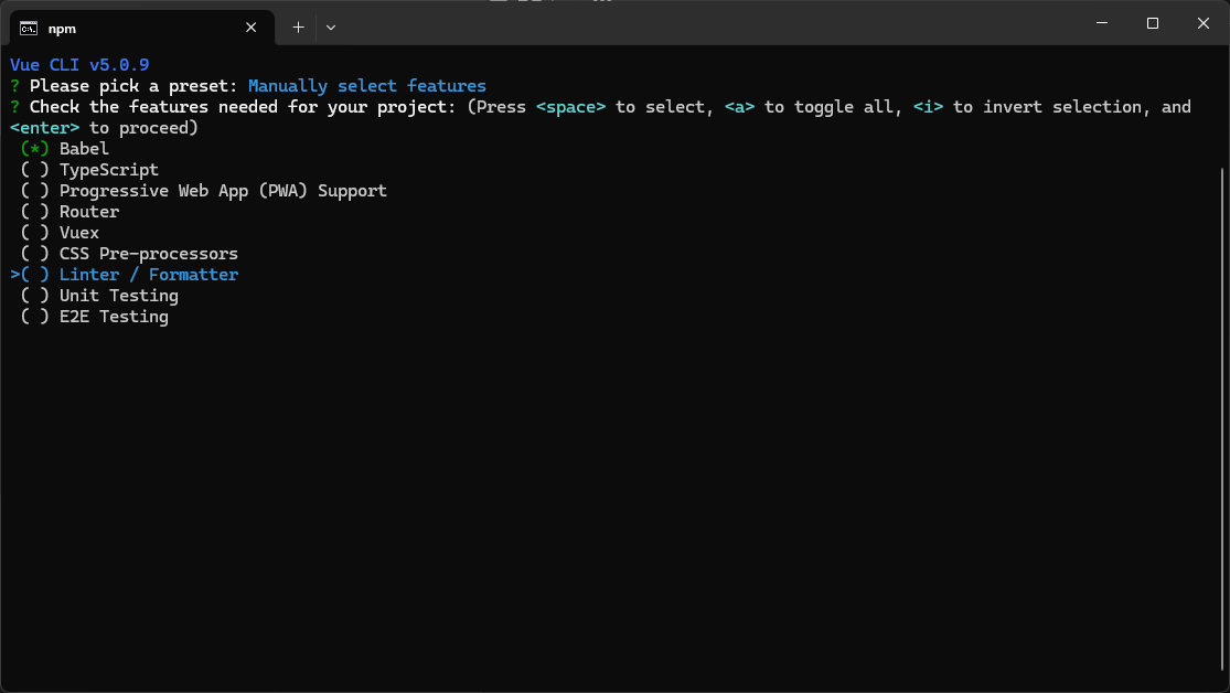 Linter / Formatter上,按空格去掉勾选,回车到下一步。