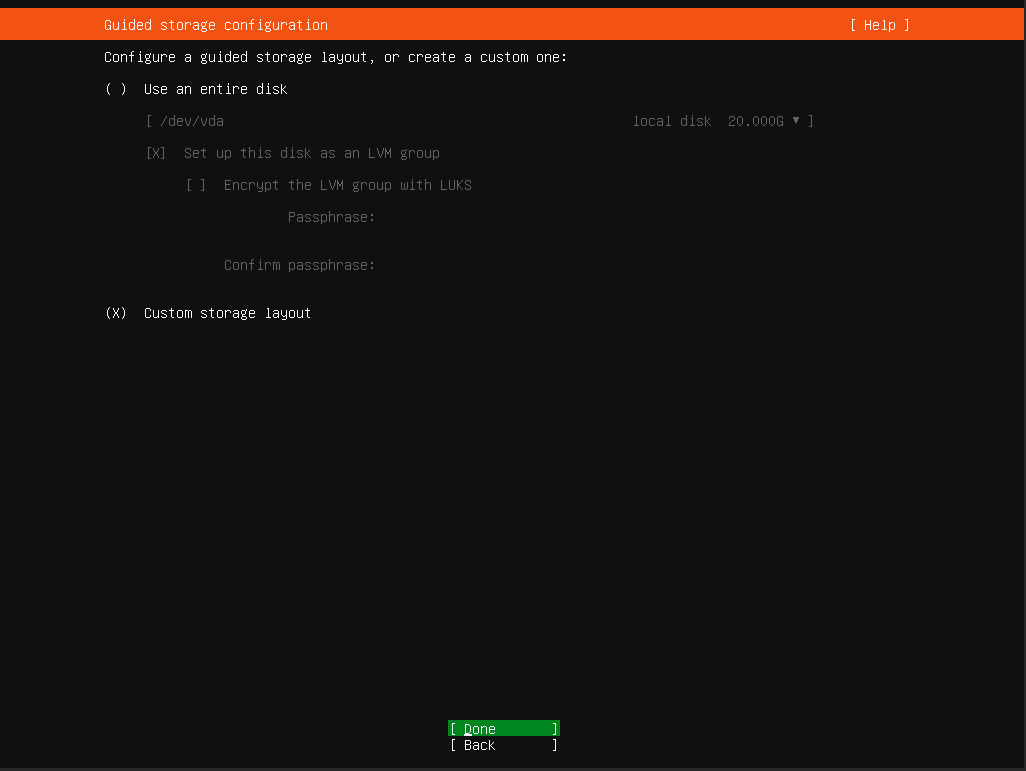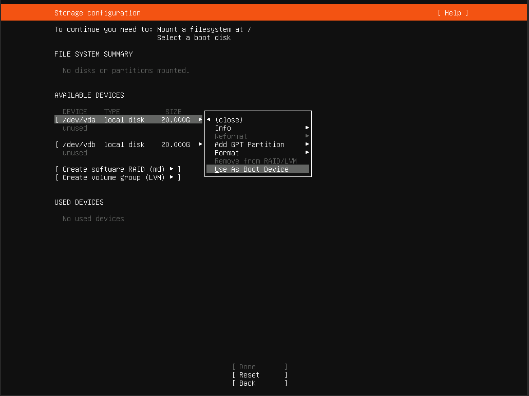 再次选中“/dev/vda”,选择“Use As Boot Device”并确认。此操作是为了在系统盘上创建引导分区。