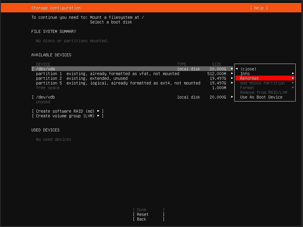 选中“/dev/vda”并按回车,然后进入“Reformat”选项。此时会提示你,此操作会清除所有数据,确认即可。如果你的数据盘也有数据,也按此方式清除掉所有分区。