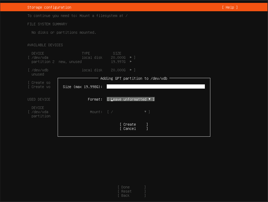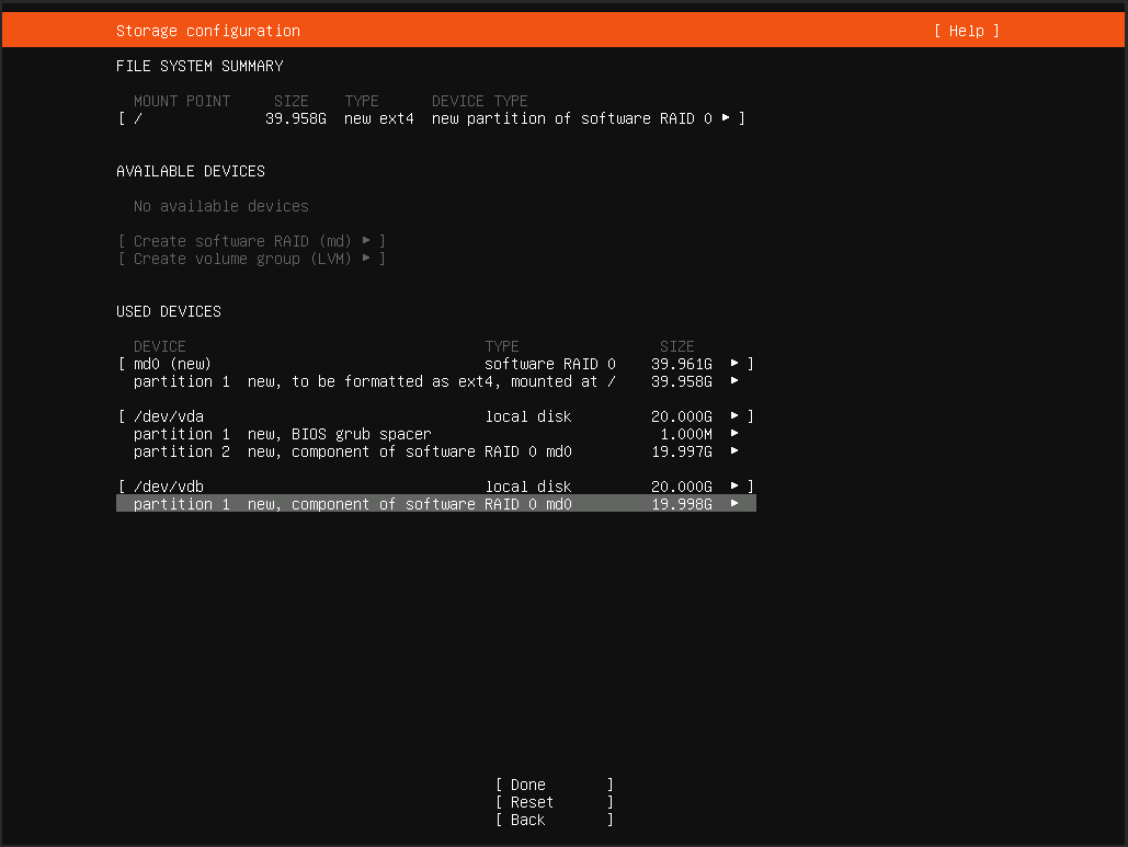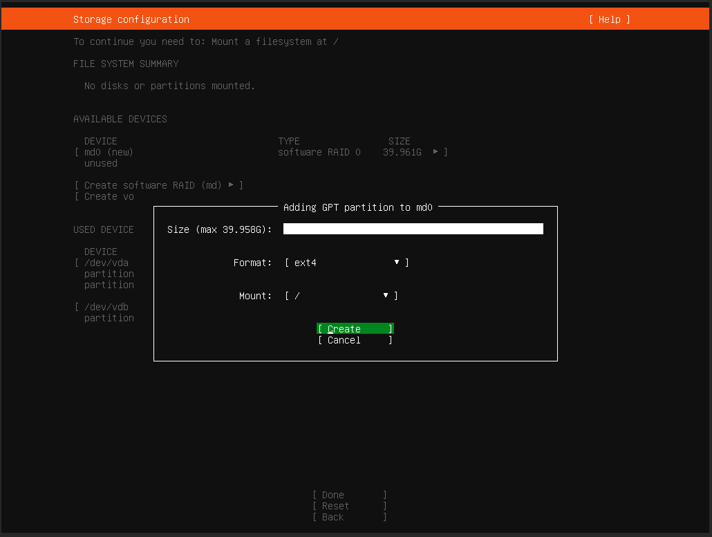 此时你会在“AVAILABLE DEVICES”中看到刚才创建的 RAID 磁盘。选中并进入“Add GPT Partition”创建分区,“Format”选择“ext4”,“Mount”设置为“/”,即根目录。